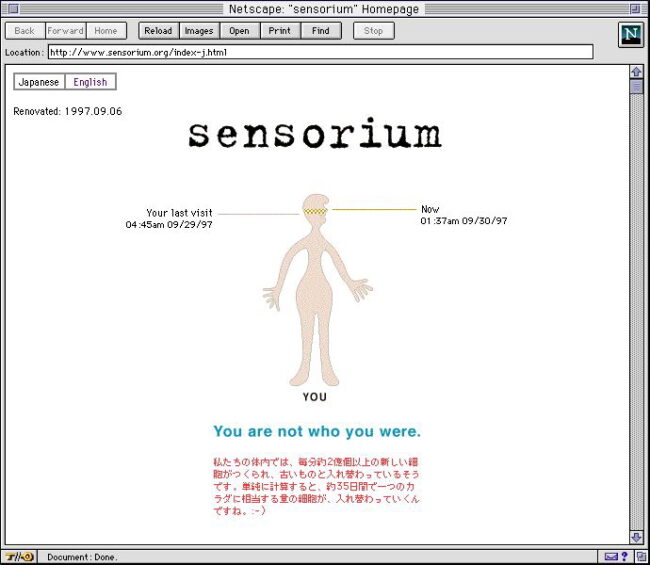 sensorium初期のトップページは、AXISの宮崎さんが担当していて、オフィスの片隅の植木鉢を定点撮影し、毎日ちょっとずつ芽が伸びていくのを更新する、というものでした。まだウェブカメラではなく画像差し替えでしたが、「離れた場所の今を見る」ということ自体が新しかった。その後、僕がデザインを引き継ぐタイミングで、もっとsensoriumらしい時間の実感を扱えないかと考えて作ったのが《You Are Not Who You Were》です。人間の細胞がどれだけ入れ替わっているかを、その人のアクセス間隔によって可視化する。ブラウザを閉じている間にも自分の身体は変化し続けている。あなたは前回アクセスしたときのあなたではないという事実を、数字やアニメーションとして示す作品でした。