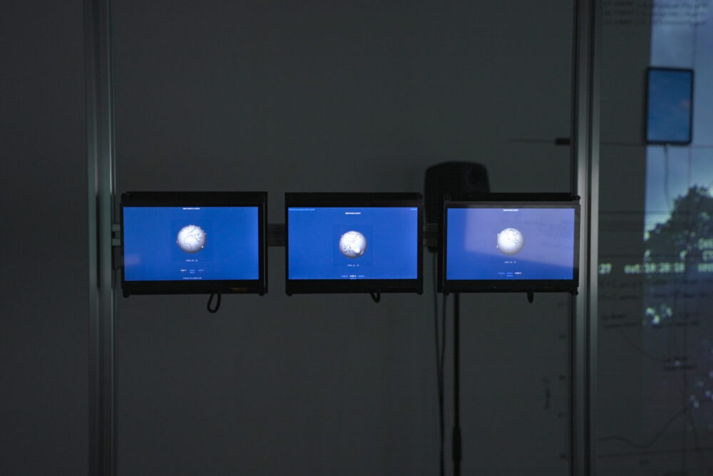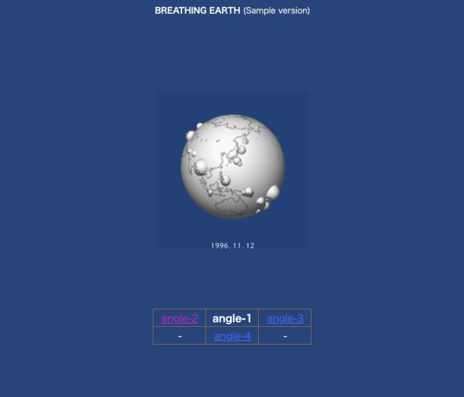 世界中で日々観測される地震データを取得し、その震源位置と震度を、白い地球儀の表面にぽこりと盛り上がる球体として表現する。地球がまるで生きているかのように呼吸し、脈打つ様子を、軽やかなアニメーションとして体験させる作品。技術的には、世界各地に設置された地震計ネットワーク(核実験探知目的の観測網)からインターネット経由で公開される国際データセンター(IDC)の最新地震情報を利用し、それを日次で自動収集・更新して最新2週間分のGIFアニメーション映像として生成していた。自然(地殻活動)・技術(センサーとネット)・情報(データ可視化)という異なるレイヤーに広がるエコシステム同士を繋ぐことで、観客は物理的地球と情報環境が融合した「拡張された生態系」を体験し、自身もその一部(地球の神経系の一端)であることを感じることができる。