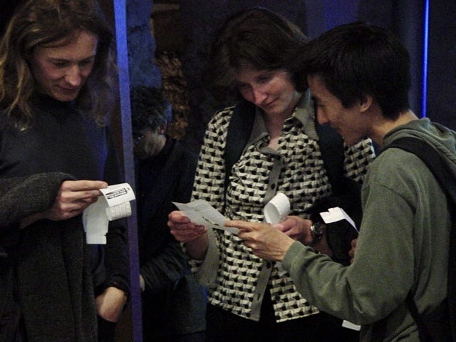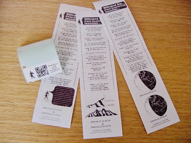 世界のどこかでは出生や死、地殻変動、交通、天候といった事象が絶えず進行している。《While you were…》は、そのような地球規模の時間を個人の時間と結びつけ、「世界は同時進行している」という認識を可視化する作品。sensoriumがオーストリアで開催されたZEIT(時間)展のために制作した来場者参加型のインスタレーションで、会場入口で配布されるQRコード付きの腕時計型ラベルが来場者の入場時刻を記録し、退出時に手渡されるレシートで自分自身がここにいる間に世界で起きたこと」を知ることができた。レシートには、展示を鑑賞している滞在時間に世界で実際に起きた出来事、出生数、地球の公転距離、絶滅した言語の数などの統計が印字される仕組み。