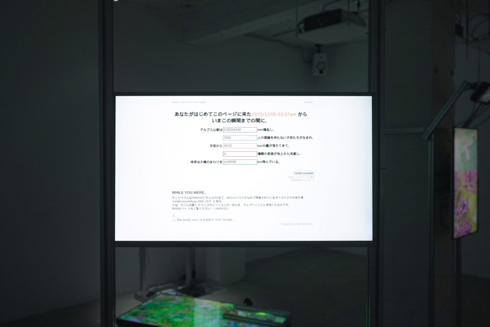 東泉 《While you were…》はユーザーが展示空間に滞在しているあいだ世界で起きた出来事をリアルタイムに拾い、それを退場時のレシートとして返すという作品です。「あなたがここにいる間に、世界ではこういうことが起きていました」と提示する。単に展示を見ている間に世界で何が起きたかをプリントして渡す作品ではなく、「人が持っている時間感覚そのものを揺らがせる装置」でした。あなたが気づかない速度で世界は動いているし、あなた自身も別の時間を生きている。つまり、sensoriumが扱ってきたインターネットのリアルタイム性を、はじめて人の時間へと結びつけた試みだったんです。sensoriumは常にインターネットそのものを扱っていたわけではなく、インターネットをリアルな世界にもう一つの感覚器官として接続する方法を探っていた。地震、天気、太陽風、身体、時間、どれもインターネットの外にある現象ですが、それをネットワークと接続することで人の感じ方そのものを変えようとしていたわけです。だから、《While you were…》がインターネットから外に出たというより、sensoriumが最初から目指していたライン上に、自然と入っていったといえます。