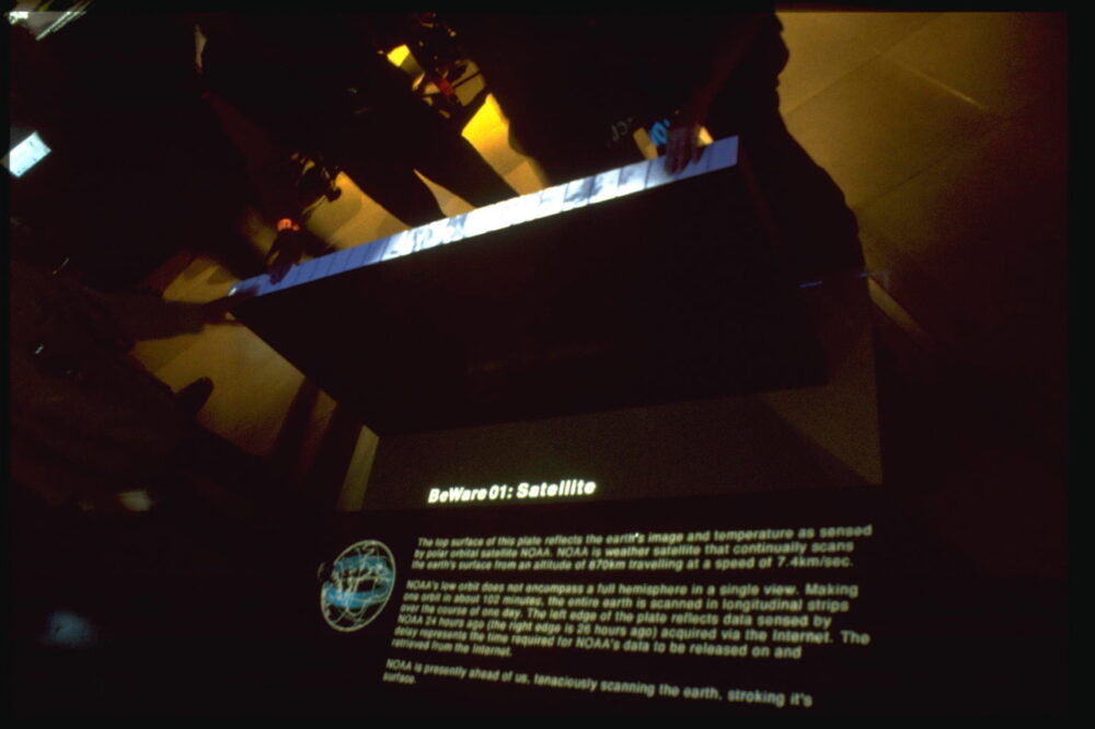 江渡 《BeWare》は本当に大変でした。「触ると地球の温度がわかる」というコンセプトなんですが、これを物理的に成立させるのがとにかく難しい。小さなプレートを触ると、北極の場所はひやっと冷たく、砂漠のあたりは熱を帯びている。いま聞けばシンプルですけど、これを一枚の板の上で再現するには、とんでもない技術的工夫が必要だったんです。当時、原宿にあった国際メディア研究財団に小野充一さんというハードウェアの天才がいて、その人が作りました。ペルチェ素子という、冷却も加熱もできる電子部品を大量に使って、場所によって温度を上げたり下げたりするんです。ただ、冷やせば冷やすほど裏側にはものすごい熱がたまるし、温めれば温めたで別の部分が冷えない。裏側の熱処理がとんでもなく難しくて、床下に水冷のパイプを通したり、熱を逃すための仕組みを追加したり、調整が本当に大変だったそうです。《BeWare》のすごいところは、単にインターネットのデータを触れる形にしたというだけじゃなくて、温度という物理的なパラメータを地球規模の現象に対応させた点です。これは世界的に見てもかなり早い試みだったと思います。同じ頃、MITの石井裕先生がタンジブルインターフェースという概念を打ち出し始めた時期で、触覚を使って情報を扱うデザインの研究が盛り上がり始めていました。その潮流とほぼ同じタイミングで、sensoriumは温度を使って「地球を触る」作品を作った。《BeWare》は西村さんが発案して、小野さんがハードを作った作品です。私自身は現地であるリンツで現場対応という形で制作に関わっていましたが、実装はすべて小野さんによるものでした。