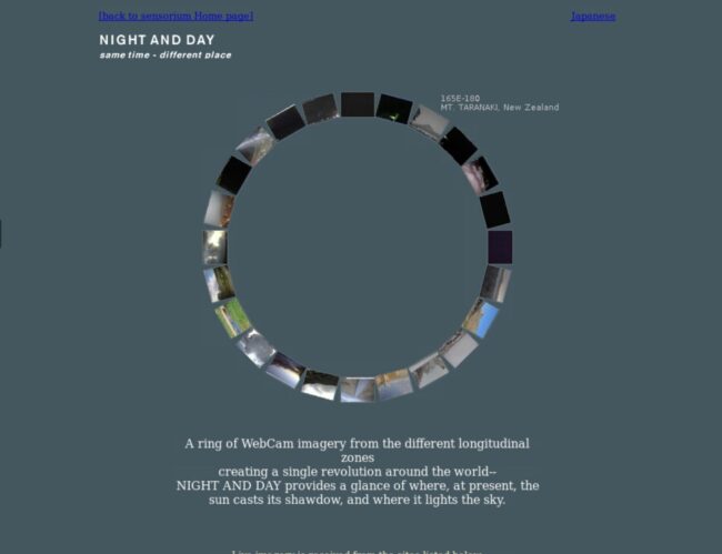 世界中に設置されたウェブカメラの画像を連続的に取得し、地球を一周するように配置することで、昼と夜の境界がゆっくりと移動していく様子がそのまま画面上に現れる。公開されている監視カメラや自然観察カメラで撮影されたライブ画像を用いて、惑星スケールの時間の流れを静かなまなざしで提示する作品。その背景には、1990年代半ばに僅か数台しか存在しなかったライブカメラが、数年のうちに爆発的に増加したという技術的転換がある。ケンブリッジ大学のコーヒーポットカメラが世界的な偶然として共有されたように、遠隔地の「今」が突然つながるという出来事は、初期インターネットに特有の感覚だった。本作は、現在使用できるカメラを再度収集し直し、江渡浩一郎氏による当時の実装を修正。Javaアプレットが再生できる仮想環境上で実行できるようにしたもの。