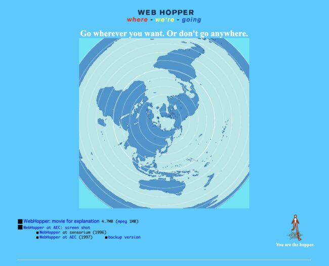 江渡浩一郎さんがsensoriumに参加したことももう一つの転機です。当時まだ学生で、「とんでもなく面白い人物がいる」と名前だけ先に聞いていました。実際に会ってみると、まさにその通りで、アートとエンジニアリングのどちらにも寄り過ぎない独特の感覚を持っていて、sensoriumという混成チームと非常に相性が良かった。彼がもともと考えていた《WebHopper》の原案が、sensoriumの企画群の中にすんなり溶け込んでいったのも当然だと思います。