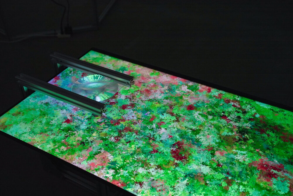 Kazuhiro Tanimoto 正直なところ、私はこれまでオンラインで作品を公開することが多かったので、物理空間での鑑賞を意識してきませんでした。今回の展示で光学レンズを用いたのは、セルオートマトンの多様な動きを拡大して観察するのが単純に面白かったからです。もともと私は、自然現象のような、細部で複雑な変化を続けるものをじっくり観察することが好きです。レンズを覗き込むという行為を通して、鑑賞者にもそのような観察の楽しさをそのまま感じてもらえればと思いました。