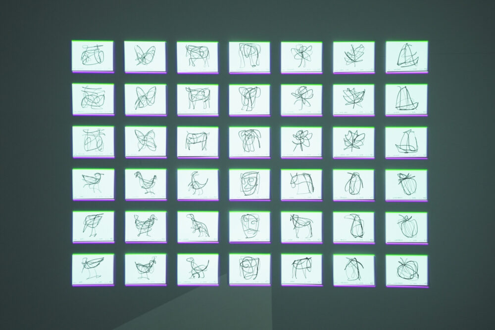 Matt DesLauriers 《Latent Dispatch》は、ニューラルネットワークがどのように作動しているのかという関心から生まれたリサーチ・プロジェクトです。この作品では、機械がトレーニングデータをどのように知覚し、解釈し、世界を実現しているのかを、人間が同じ課題に取り組む場合と並べて提示しています。一人の人間が描くドローイングには、その人固有の記憶や考えが反映されますし、プロンプトや描画指示に対する解釈も大きく異なります。一方で、機械はコードによって強く制約されており、常に特定のパターンや抽象へと向かいます。機械によって生成されたドローイングは、AIデータセットの偏りや限界を明らかにします。ただし同時に、そこにはある種のエレガンスも存在します。モデルは与えられたプロンプトの最も純粋な形を生成しようとし、それは人類がこれまでに公開してきた情報の数学的な平均のようなものになります。複数の機械生成ドローイングを見ると、個別の表現というよりも、統計的な原型を見ていることが多く、そこからプロンプトや主題を疑う余地はほとんどありません。