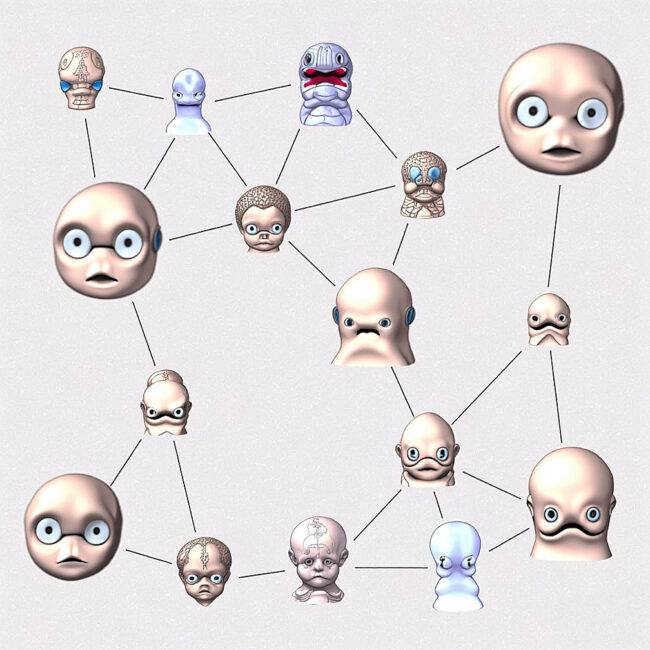 Sarah Friendによる《Prompt Baby》は、AI生成と人間の関与を通じてアートの生成プロセスそのものを問題化する試み。鑑賞者やコレクターから「プロンプト(AI への指示)」を募集し、それを基に AIによる画像生成を行うことを作品制作の中心に据えている。Prompt Babyの特徴は、単なる自動生成ではなく、プロンプトとアーティストの関係性を介して作品が成立する点にある。Friendは提出されたプロンプトを選別し、必要に応じて修正や対話的なやりとりを行いながら、生成された画像の最終形を練り上げた。各作品には、鑑賞者の意図とアーティストの解釈という二重の主体性が宿る。鑑賞者が単なる消費者ではなく生成行為の共作者となる構造になっている。AI・プロンプト・鑑賞者という三者の関係をコード化し、共同制作とジェネラティブ技術の新たな可能性を提示する試み。