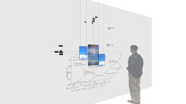 Yoshi Sodeokaによる《21.000》は、大型インスタレーションとNFT作品である。作家が10年分にわたり撮影してきた太陽の映像が黄金比グリッドと数式のメモが書き込まれた壁面に投影され、幾何学的秩序と手描き線が静かな緊張感を生み出している。空と鳥の映像が別スクリーンに浮かび、多層的なイメージの庭が現出する様は、計算と即興、人間の痕跡が同じ空間に共存することを示している。デジタル制作過程のレイヤーをフィジカルな空間で可視化することで、スクリーン内に隠された構造をあぶり出すことを試みる作品でもある。東京のNEORT++ギャラリーで展示されると同時に、Verseプラットフォーム上でインタラクティブなインストール指示を含んだ1点ものの作品として販売された。