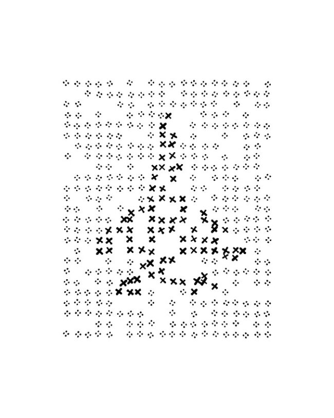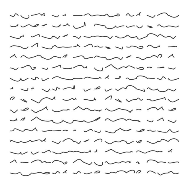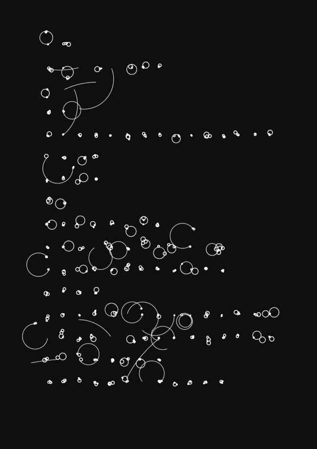 《Just like you》は、《Predeterminate, yet unknown》同様に10秒ごとの世界共通時刻をもとに描画が再構成され、全ての環境で同時に同じ像を映し出すジェネラティブ作品である。暗い背景に細い白線がゆっくりと描かれては消え、中心付近にごく短い縦線がカーソルのように点滅する。これらの動作は「書く・考える・消す・また書く」という人間の筆記・思考プロセスを視覚化したものだ。タイトル《Just like you》(あなたと同じように)の示す通り、人間が思考に迷い反復するように、このプログラムも内部で決定と再生成を繰り返している。外から観測できない内部状態が確かに存在しつつ不可視である様は、ちょうど意識下に潜む思考のようでもある。コードによって「思考が生じる仕組み」を再構築し、静かに書き続けるもう一人の存在と鑑賞者を向き合わせるアセミック詩である。
