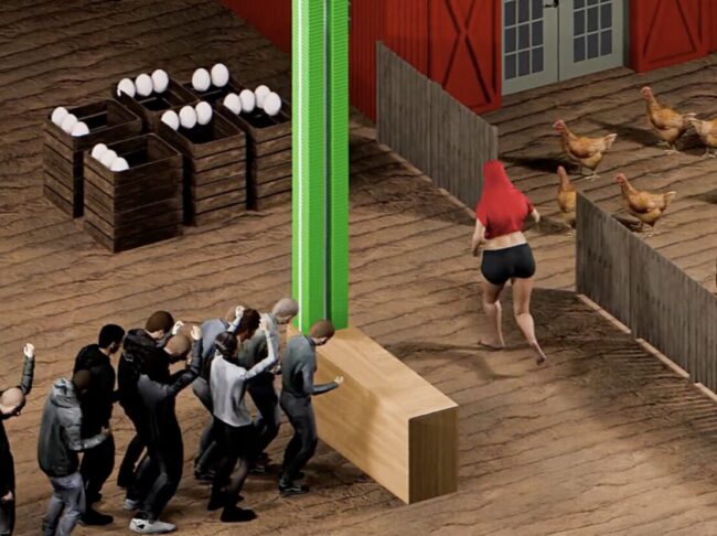 Mitchell F. Chanによる《ZANTAR》は、ゲームとしての体験と経済システムの批評を同時に成立させる寓話的メディアアート。作品そのものは「ゼラチン状の立方体」として描かれるプレイヤーキャラクターを操作するゲームであり、その立方体が村人や戦士を次々と捕食し、架空の仮想通貨「ビービーコイン(BB Coin)」を獲得していくという仕組みを持つ。単なる娯楽としてのゲームではなく、アテンション経済や搾取、主体性の幻想を構造的に表現するインタラクティブ作品として設計されている。主体性が幻影に過ぎないという現代の注意資源の循環構造を反映しており、プレイヤーが能動的に操作しているつもりでも、システム全体に乗せられた経済の論理と搾取の機構に巻き込まれていく体験となっている。ゲーム、ブロックチェーン、文化批評が交錯し、鑑賞/プレイ行為そのものが作品領域へと変容する試み。