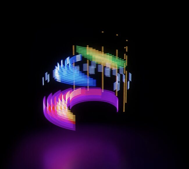 《Link2》は、Andreas GysinとSidi Vanettiによる《Link》シリーズの一環として制作された、長時間露光とカスタムハードウェアによる光の幾何学的アニメーションをデジタル化した作品。制作プロセスは非常に物理的であり、LEDアレイを備えた機械式プロッタ(XY プロット装置)を用いて、プログラム可能な光の列を動かしながら約30秒の長時間露光を行うものである。その間、カメラのシャッター、プロッターの動き、LEDの発色・輝度が カスタムソフトウェアによって精密に同期制御される。このようにして撮影された各フレームは、暗い環境の中で立ち現れた光の軌跡として記録され、三次元的な光の幾何形態が、まるで空間に浮かぶような視覚効果を生み出す。作品のアニメーションは、これらの静止画フレームを カスタムスクリプトで連結再生することで成立する。 物理的生成プロセスとデジタル再生を不可分に統合する実験であり、物理世界における光・運動・時間という三要素が交差する「物質的ジェネラティブアート」となっている。