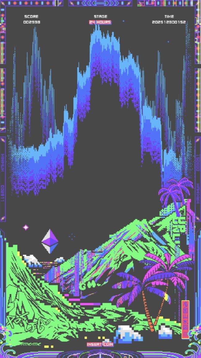 EXCALIBURによる《Multinational Landscape Ethereum》は、山水画とEthereumブロックチェーン上の実時間データ(価格チャートなど)を重ね合わせたコンセプチュアルなピクセルアート作品。荒々しい山並みのドット絵風景に、Ether価格のリアルタイム変動グラフが表示されており、金融データが風景の一部として組み込まれている。結果として自然の静謐な景色と、人間が生み出した多国籍な経済活動の軌跡とが一つの画面に共存し、異質な要素の対比から独特の美を生んでいる。データを芸術へと昇華し、東西の視覚文化を交錯させるこの作品は、視覚表現としての技巧を光らせながら、現代の「真の風景」はグローバル市場と不可分であることを静かに示唆している。