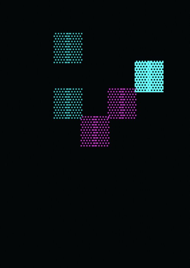 Jeff Davisによる《Progression》は、ジェネラティブアート黎明期から活躍する彼が、その作風を極限まで純化・簡素化した意欲作。タイトルが示す通り、本作では色彩と形状の連続的な変化(プログレッション)がテーマになっている。描かれるのは明快な矩形の配列で、それがパラメトリックに少しずつシフトしながら画面上に配置される。色使いはJeff Davisが30年にわたり追求してきた配色理論が反映され、原色やパステルなど「未濾過の色彩」が大胆に用いられている。各作品ごとに異なるシード値によって微妙に構図のリズムや均衡が変化し、777種それぞれに固有の表情が与えられている。ジェネラティブアートの進化と自らの歩みを重ね合わせた、Davisのキャリアを象徴する作品である。
