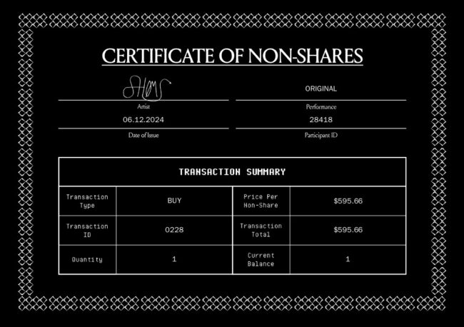 SHL0MS による《SECURITY》は、経済的な意思決定と投機行動を観察可能なアートとして制度化したプロトコル作品。もともとは 2024年に、FriezeやArt Baselといった主要アートフェアの外に違法駐車されたバンで、指数関数的に増加するボンディングカーブに沿って価格が変動する「紙の証明書」を提供するパフォーマンスとして始まった。このパフォーマンスをデジタル空間の証明書としてトークン化し、その価値をブロックチェーン上でリアルタイムに取引することが可能となった。従来の作品が固定的な価値を帯びるのに対し、本作では価値はあくまで マーケット参加者の投機心と皮肉的な関心によってに集合的に決定される仕組みである。ボンディングカーブ自体が作品の中核メカニズムであり、指数関数的に価格が変動する構造が、投機的バブルや市場の不安定性そのものを表現している。作品価値は売買のタイミング、参加者間の行動、そして集団としての価値判断によって動的に成り立ち、その変動こそが作品体験の中核となっている。
