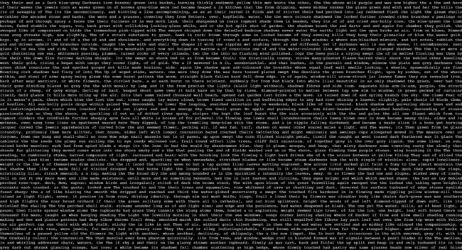 Wen New Atelierによる《Data Waves in the Rising Sun》は、ヴァージニア・ウルフの小説『波』(The Waves)のテキストをコードで解体・再構築し続ける作品。プログラムは原文から数万字に及ぶ単語をランダムに抽出・増幅し再配置し続ける。生成テキストは約0.2秒ごとに更新され、観者は読む暇もなく変化し続ける文字列の中で単語の残像しか捉えられない。絶え間なく流れ続ける言葉はデジタルの波となり、限られた文章から無限にも思える語の組み合わせを生み出すことで詩的創作へと昇華している。文章生成のプロセスを凝縮し、「文学とは何か」という問いに対する現代的な解答を提示する作品である。